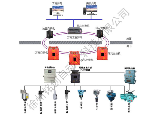 礦用排水監(jiān)控系統(tǒng)采用可編程控制器(PLC)進行控制,通過圖形、圖像、曲線、數(shù)據(jù)、文字等方式,實時準確地反映系統(tǒng)工作狀態(tài)以及水倉水位、電機工作電流、電機溫度、軸承溫度、排水管流量、水泵狀態(tài)等參數(shù)。根據(jù)水倉的實時參數(shù)控制水泵輪流工作與適時啟動備用水泵,實現(xiàn)水泵按照水艙水位的高低和供電線路載荷情況自動啟停、自動輪詢、避峰填谷。同時,系統(tǒng)通過傳輸設(shè)備聯(lián)網(wǎng),可以實現(xiàn)多泵站無人值守,大大降低礦井泵站運行人工費用,節(jié)能減排,減員增效,有效提高礦井安全生產(chǎn)和自動化控制水平。